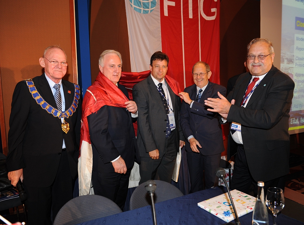 Stig Enemark, Warwick Watkins and Craig Sandy receiving the FIG flag from Haim Srebro and Joseph Kraus.