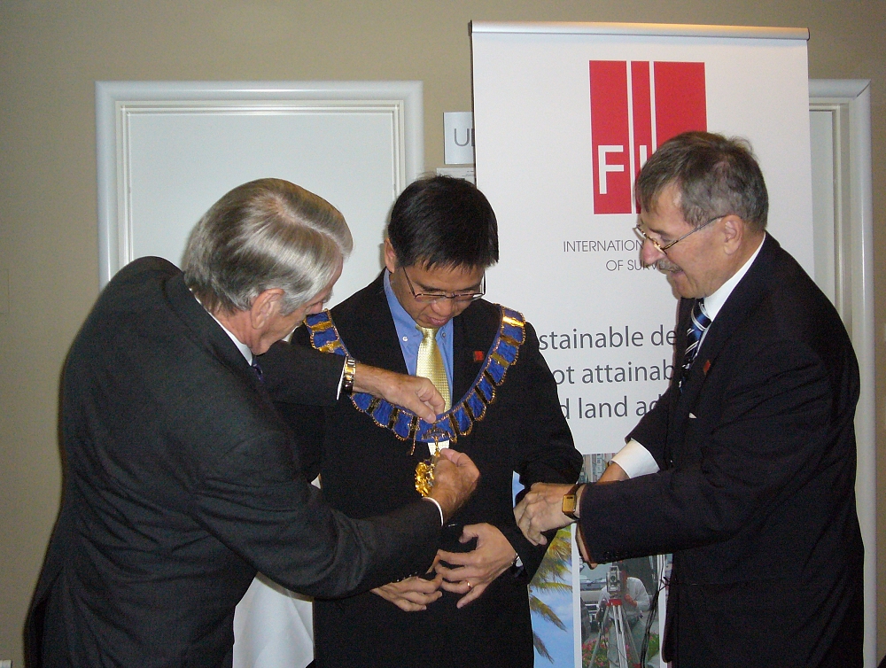 FIG President Stig Enemark (2007-2010) together with the new President CheeHai Teo with the President's chain of office and Honorary Presidents Robert W. Foster and Juha Talvitie that assisted in the ceremony.
