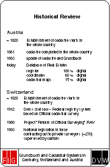 In the early 1980`s a project was started, called "Reform of Official Surveying" in order to emphasize the enlarged user community by minimizing the federal regulations, increasing actuality, liberalising data acquisition methods and so to improve the cadastral services. Since 1993 a new national legislation has been put to force. The realisation has been started by legislation on cantonal level and the necessary organisational and financial dispositions.