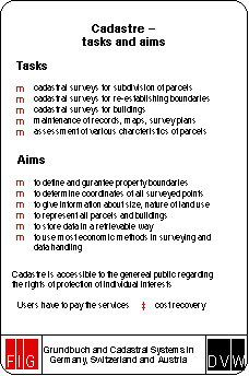 The cadastre, based on cadastral surveying, shows the division of the ground in form of parcels and contains information about the de facto status of property (location, size, use etc.). The land register contains the describing parts of the cadastre. Therefor only both systems in combination are able to give a complete overview about legal and de facto land tenure. Both registers must be constantly updated and kept in correspondence with each other.