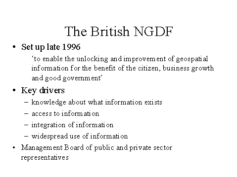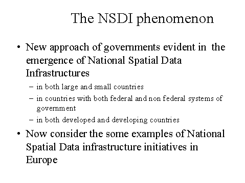 The presentation will consider some recent developments in spatial data infrastructures in Europe. It will be divided into three parts. The first of these examines the changing technological and governmental context that has prompted the recent surge of national spatial data infrastructure initiatives in Europe and elsewhere in the world. Then the experiences of NSDI initiatives in Portugal, Netherlands, Britain and Hungary will be described and evaluated in comparative terms. The final part of the presentation will describe the work that is being currently undertaken by the European Umbrella Organisation for Geographic Information (EUROGI) to facilitate the development and implementation of spatial data infrastructures at the national, regional and global levels.