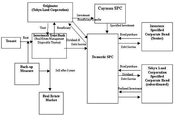 The fundamental structure of the securitization of real estate by SPC is the structure to raise funds directly from investors by issuing securities such as corporate bonds and stocks backed by cash flow (income of rent and capital gains etc.) which is generated by the assets which are transferred to SPC from an originator in order to separate from other assets. SPCs exist only for issuing securities and are dissolved by disposal of the real estate.