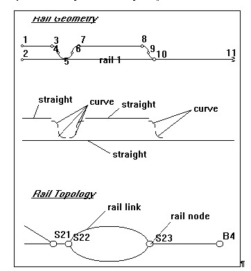 Figure 3 demonstrates the relationship between the topological and geometrical information. Any rail geometry may be modelled topologically in the above described way. The inverse task is, however, non-uniquely defined, since it is possible for multiple rail geometry to be modelled with exactly the same topology.