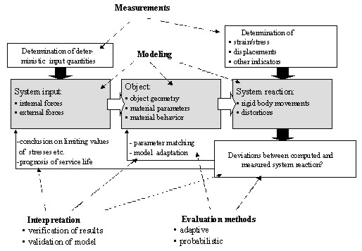 To set an example, the technical system 'construction' (Fig. 6) is stressed by internal and external forces or loads (like traffic load, wind pressure, backwater pressure, temperature etc.). These so-called input quantities (input signal) have to be determined by measurements. The reaction of the system is deformations (e.g. rigid body movements, strain). In order to model (calculate, predict) the reaction of the system as the output signal, the transmission through the object (transfer function) has to be modeled as well. Parameters to do this are in particular the construction's geometry, its material parameters and the assumed material behavior. If the two elements - input signal and transfer function - are known, the dynamic process can be modeled and the reaction can quantitatively be predicted (if need be by the aid of the Finite Element Method or another computation tool). This kind of a dynamic model is also referred to as a deterministic (Chrzanowski et al. 1990), mechanical or computational model. Consequently, error propagation should be taken into consideration (e.g. Kuang 1993; Szostak-Chrzanowski et al. 1994; DIN 1319-1997). If, how-ever, in addition also the reaction of the system, i.e. the deformations, is determined by (geodetic) measurements, the full potentiality of dynamic models becomes obvious (integrated models). The comparison of the predicted to the observed deformations may reveal some deviations which are called 'innovation' (Fig. 10). The innovation is the basic element for KALMAN-filtering techniques. Fig. 6 accentuates the components of the investigation and the assessment of a process: modeling the process (theory), performing the measurement of input and output quantities, evaluating functional and stochastic relationships, and - finally - assessing the findings by verification and validation. In this way the model can be calibrated and the dynamic process be identified. Worldwide numerous research centers are active to adapt and to apply this general interdisciplinary scenario.
