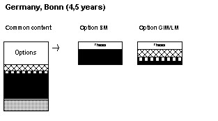 Figure 5. Surveying education (4.5 years) at Rheinischen Friedrich- Wilhelms- Universität Bonn. (Source: UniBonn, nd) Germany Land surveyor (Vermessungsingenieure) education in Germany is offered at nine universities. The programme takes 4½ years and 260 students were admitted in the autumn term 2000, giving on average 30 students per university, though actual figures ranged from 54 (Hanover) to 12 (Karlsruhe). Germany has drawn up a model plan of studies to serve as a planning guideline (Rahmenordnung fur die Diplomprufung im Studiengang Vermessungswesen an Universitäten und gleichgestellten Hochschulen, 1999). This study programme is understood to emanate from the Technical University of Hanover. Certain subjects are compulsory, but the universities are left to decide for themselves the design and scope of the courses. It took eight years to finalise the guidelines, with the result that, in a manner of speaking, they were already out of date when introduced. The delay was due to states, surveyors' associations and universities all wishing to have a say in their definition. As the Rahmenordnung (1999) is to some extent already out of date and also with the aim of selecting a university known for placing emphasis on land management, Bonn University has been chosen as representative of Germany (UniBonn, nd). As can be seen from figure 5, it includes a large element of basic Maths courses. Otherwise, the emphasis on surveying is striking. Land management, of which half of the time spent is focused on planning, is not given such prominence. There are also few special GIM courses, though knowledge of this kind is concealed within the SM subjects. Two extreme cases have been illustrated in the figure. In reality, students have a free choice of options and in this way can obtain intermediate variants. Land surveyors in Germany have been responsible for land consolidation (Flurbereinigung) in rural areas since the 19th century. Germany has also been an international pioneer in the development of readjustment procedures (Umlegung) in urban environments. By tradition, therefore, the profession has an in-depth knowledge of both surveying and advanced property management questions. To an outsider, however, and especially to land surveyors from the Nordic countries, it is surprising that German surveyors have extensive responsibilities for such advanced methods of land consolidation as Umlegung and Flurbereinigung having undergone only a somewhat limited university training in real property law, valuation and real estate planning. Nevertheless, in order to have the necessary qualifications to work in the cadastral system, - Flurbereinigung and Umlegung included - a course of practical training has to be completed (Referendarzeit). This comes after university studies and consists of periods of service with a number of authorities. It also includes a fairly large project and examinations. In Nordrhein-Westfalen, for example, the subsequent training takes two years and involves trainee service with various authorities responsible for property registration, formation of property units (land consolidation included), public planning and land surveying (LDV 1990). The final exam is common for 14 of 16 states in Germany. Roughly 70-75% of the students from Bonn University continue to the Referendarzeit. It should be mentioned that German surveyors speak about three professional pillars; geodesy, geoinformation and land management. And there is also an obvious attempt to build up land management as well as GIM at universities lacking in any of these areas.
